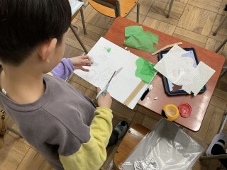 子どもたちは自分の作品を私に説明してくれたり、「ここにこれをつけたいんだけど、うまく貼れないから手伝って。」と声をかけてきます。