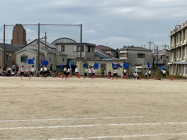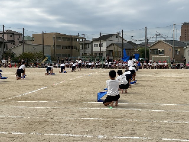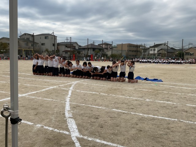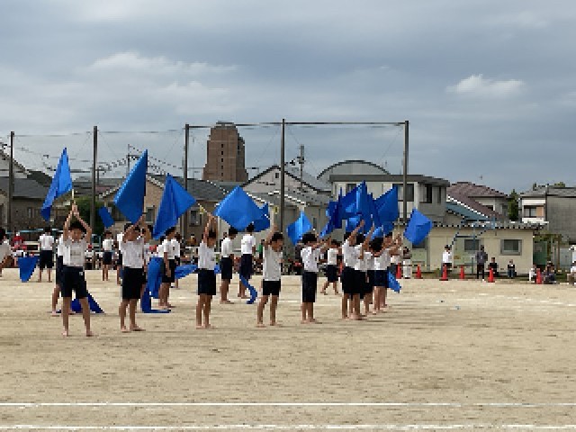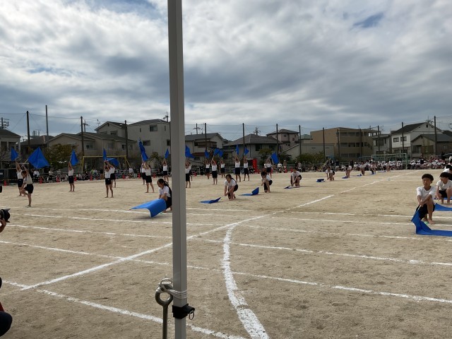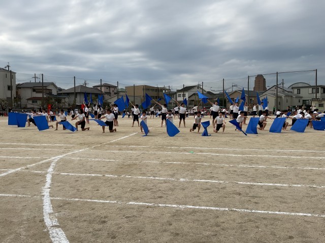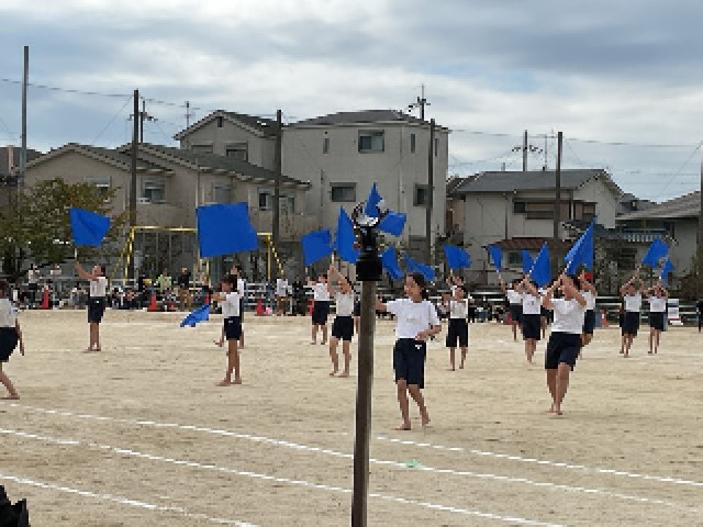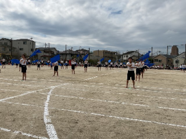 運動会の最後の種目は、5.6年生のフラッグダンス&組体操です。