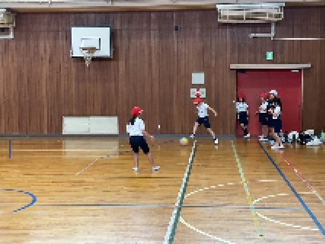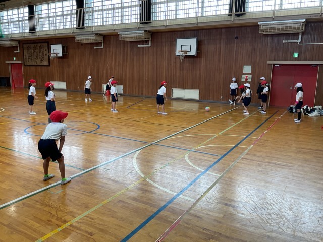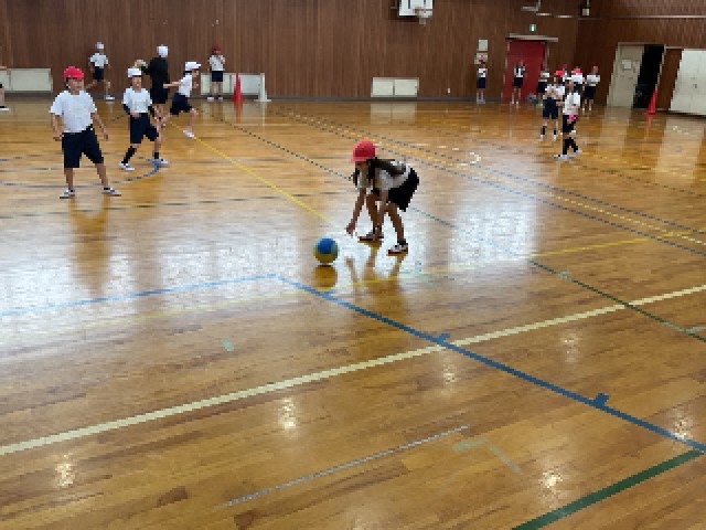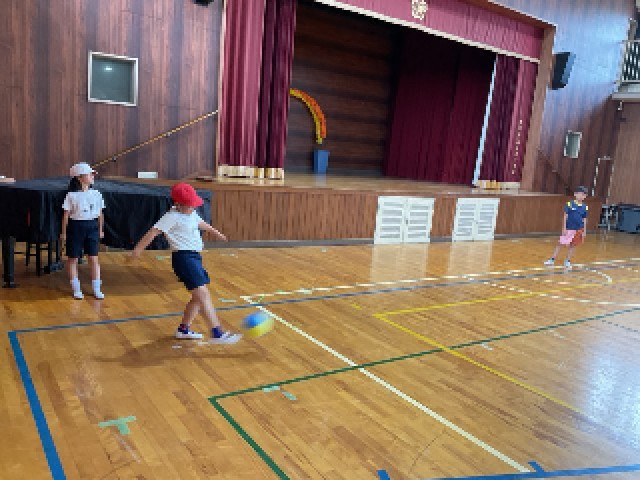3年生の子どもたちは体育館でキックベースボールをしています。