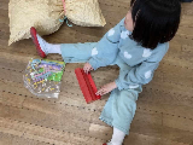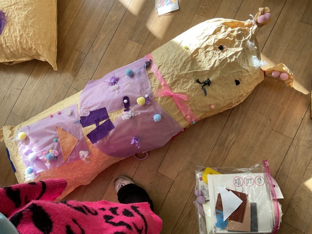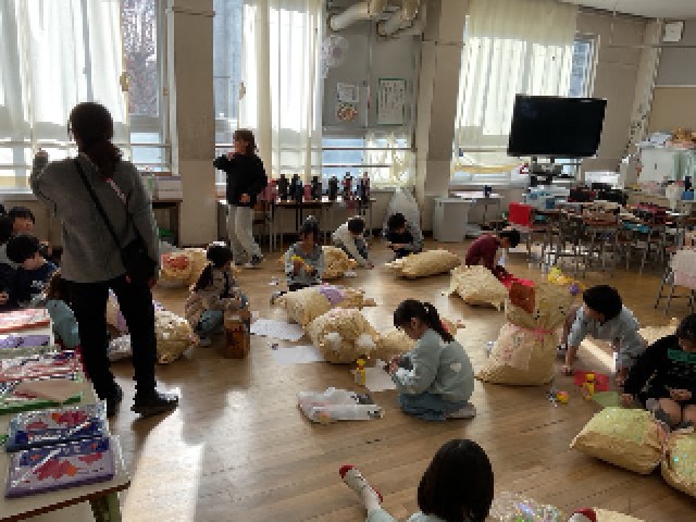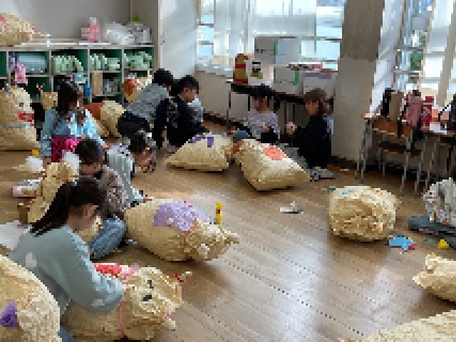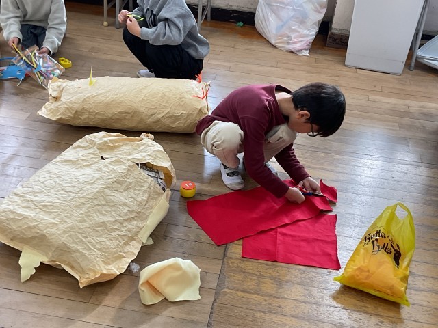 袋の中に新聞紙を詰め込んで、かわいいマスコット作りです。