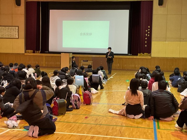 まずは体育館で、中宮中学校生徒会からの挨拶です。