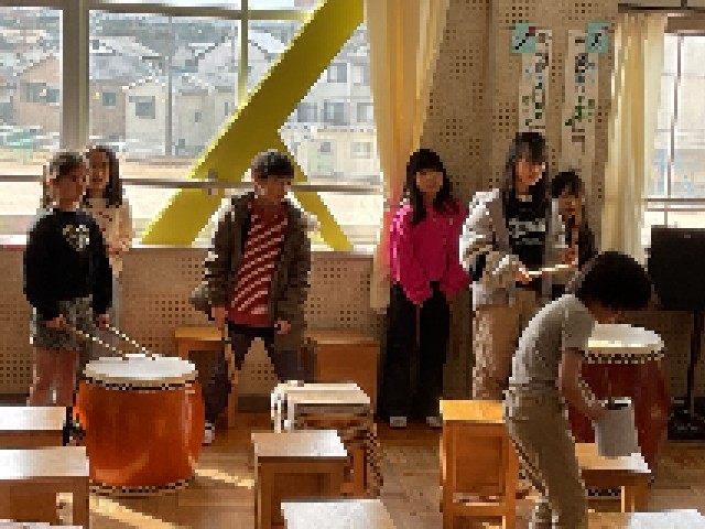 音楽の先生が叩く拍子に合わせて、子どもたちが大太鼓を叩きます。