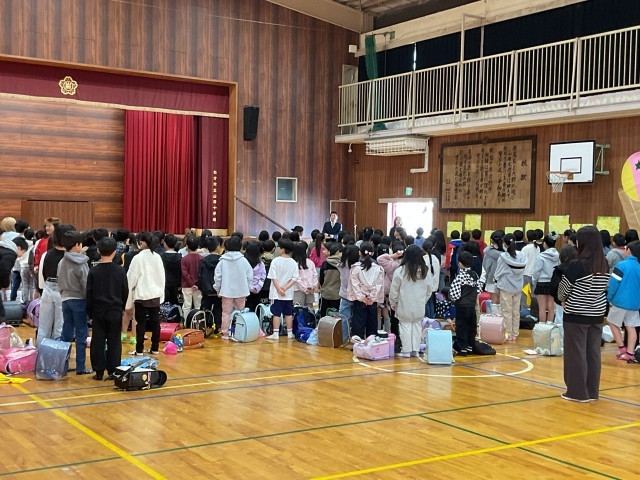 体育館に残ってクラス発表、1組、2組の担任から、お話です。