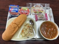 今日の献立は、ご飯、牛乳、ポークカレー、ツナと人参の甘酢和え、福神漬 です。美味しくいただきました。