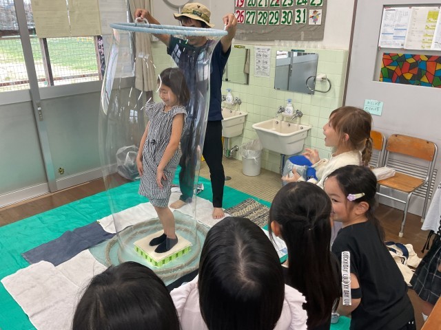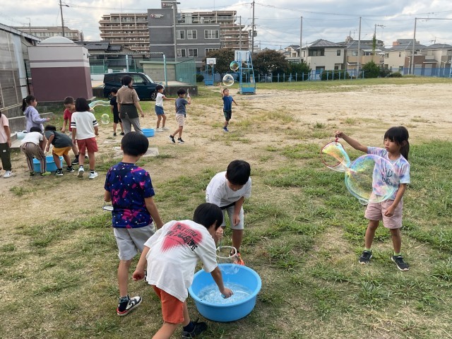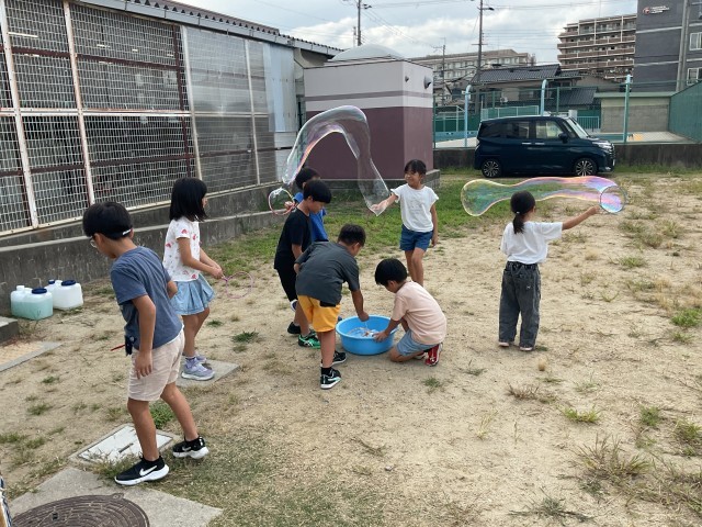 今日の放課後の時間に、留守家庭児童会で保護者の方も参加され「シャボン玉あそび」をしていました。お部屋では、大きな大きなシャボン玉に、順番に子どもたちが入れてもらっていました。シャボン玉の中にいる人も外にいる人も、この体験に大喜びでした。
