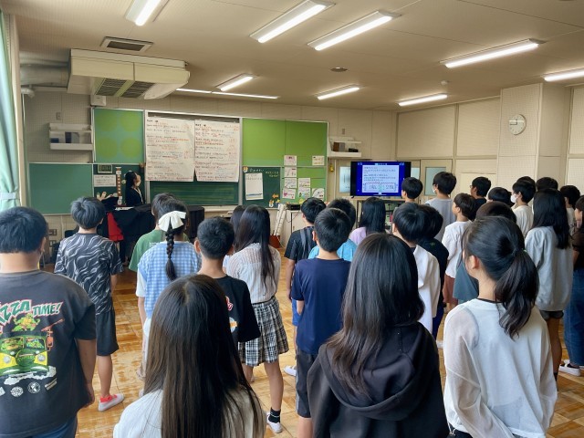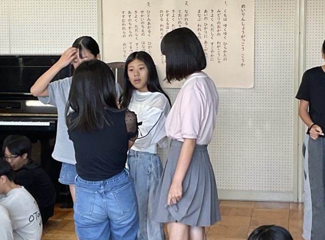 次は、各クラスから自主的に前から合唱の様子を聴きに来てもらい、歌の後に気づいたことを各々が伝えました。みんなの歌の良いところも悪いところも、真剣だからこそ伝わる4人の言葉でした。最後には1組と2組が向かい合い歌いました。本番に向けて子どもたちで作り上げる「空は今」がどのような歌になるのか、大いに期待しています!