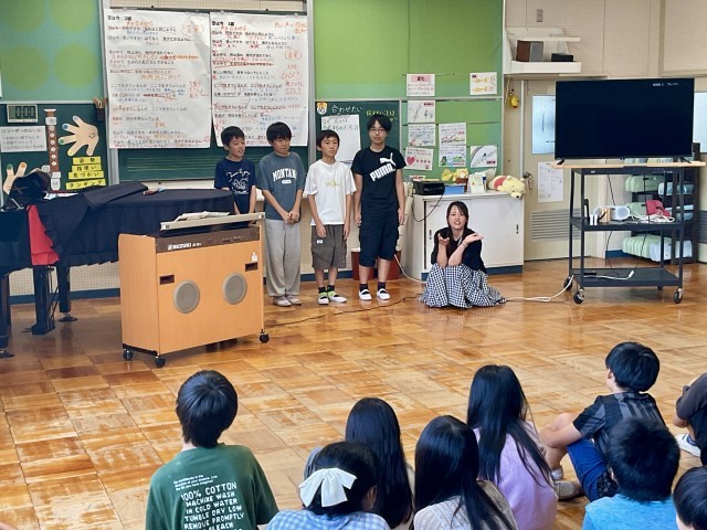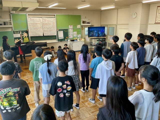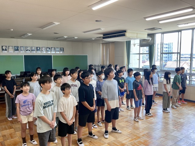 いよいよ来週にせまってきた修学旅行ですが、今日は音楽室で初めて、6年生合同の歌の練習をしました。今日まで各クラスで練習してきた「空は今」を初めて合わせるので、子どもたちにとっては納得がいっていなかったようです。1回歌った後に、気づいたことを伝え合いもう1回。
