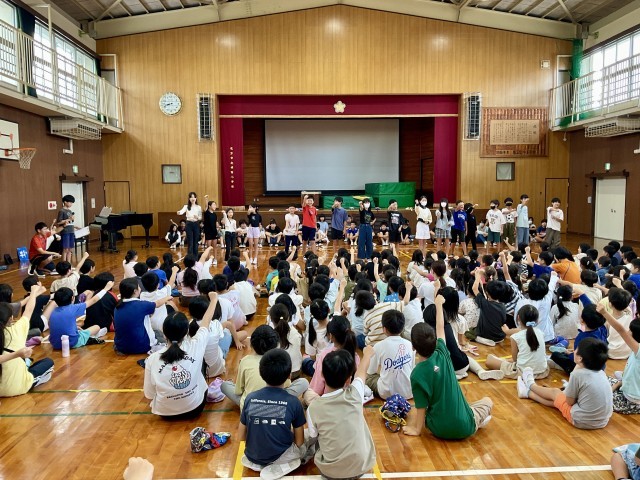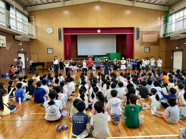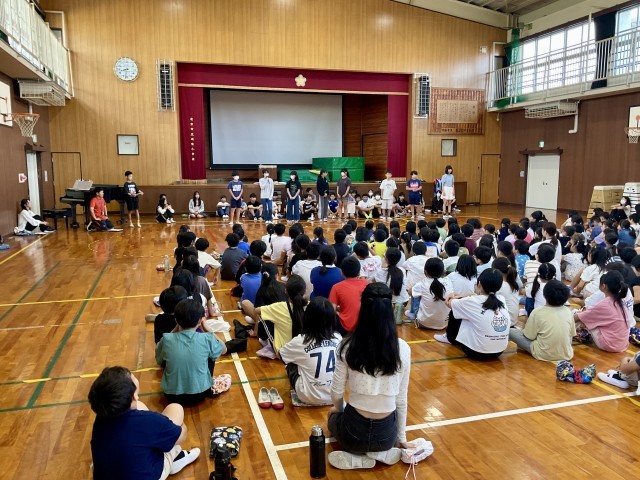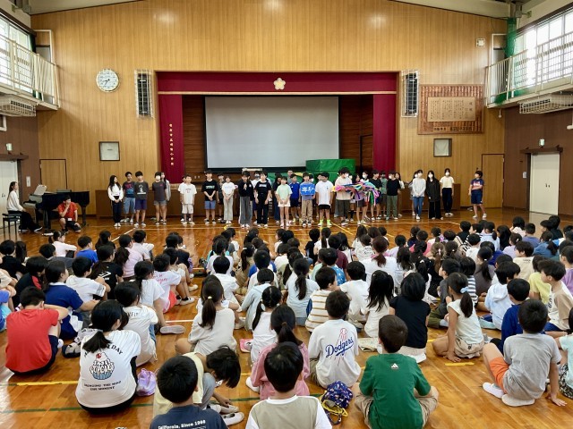 あいさつが終わった後は、明日から修学旅行へ旅立つ6年生が、みんなで作った千羽鶴を掲げながら、平和への誓いを伝え「空は今」の歌を歌いました。とてもきれいな歌声に体育館が包まれました。最後は、みんなでいつもの「ウホウホ イェーイ!明倫小!!」のかけ声。元気よく1日がスタートできました。