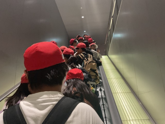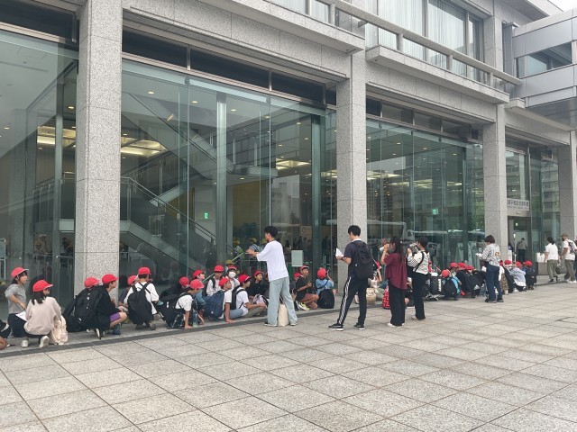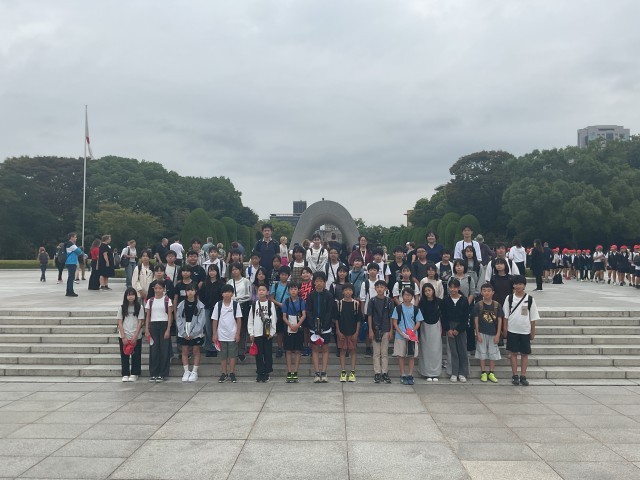 平和セレモニーの後は、原爆死没者慰霊碑の前で学年写真を撮影しました。その足で、広島平和記念資料館へ向かったのですが、ちょうど昼食どきで、館内は空いていて見学しやすそうです。