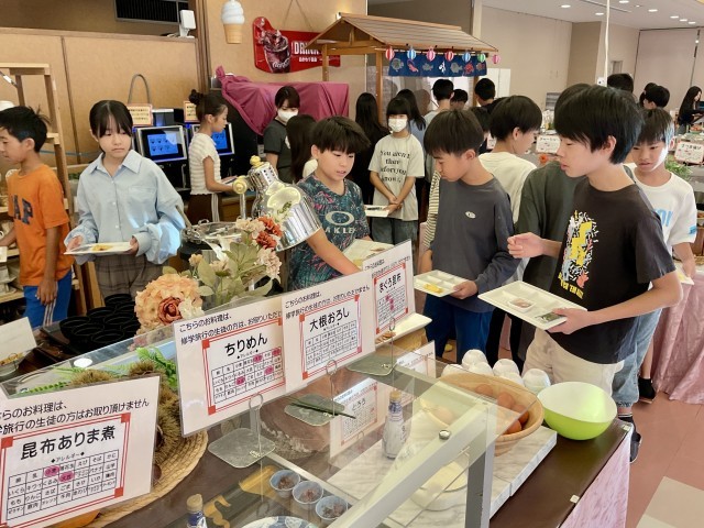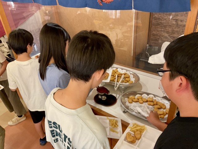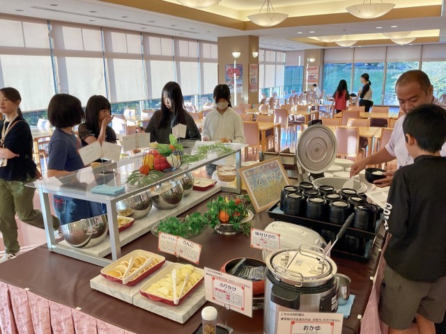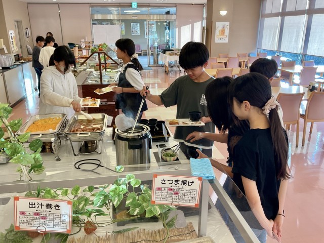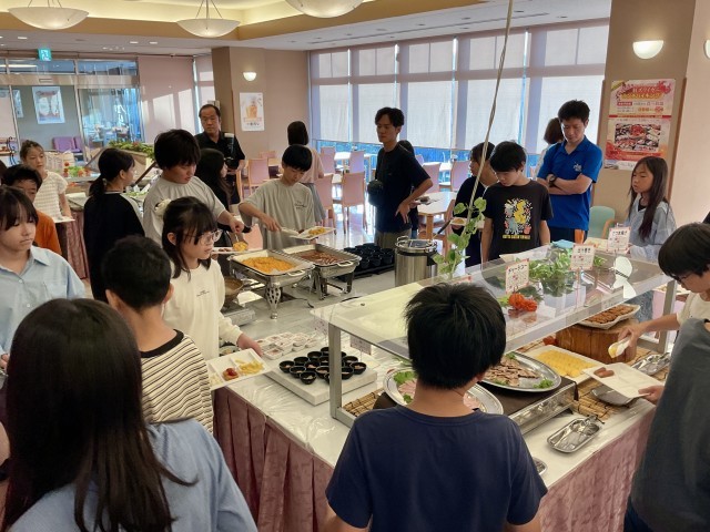 朝食はみんなのお楽しみ、バイキングです。子どもたちはとてもうれしそうに、好きなものを好きなだけ…。友だちと楽しそうにおしゃべりしながら選んでいます。やっぱり茶色が多いお皿にも、今日は目をつむります笑。