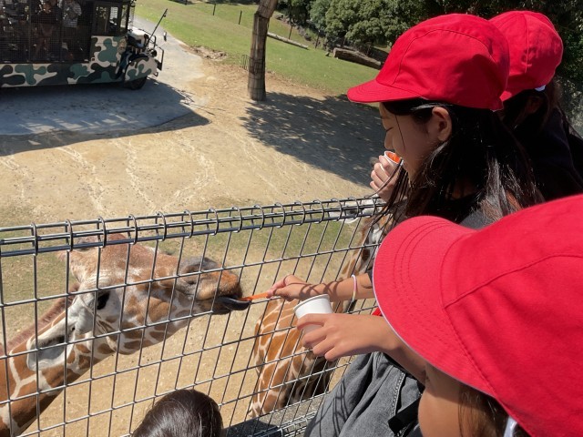 ドライブスルーサファリの後は、遊園地チームとウォーキングサファリチームに分かれて活動しました。私は、ウォーキングサファリチームと一緒に活動しましたが、前半の野生の国では、すぐ目の前にせまる動物たちの迫力やかわいさに大興奮でした。途中、餌やり体験もでき、とても喜んでいました。