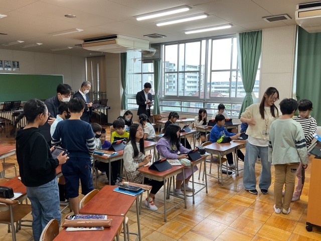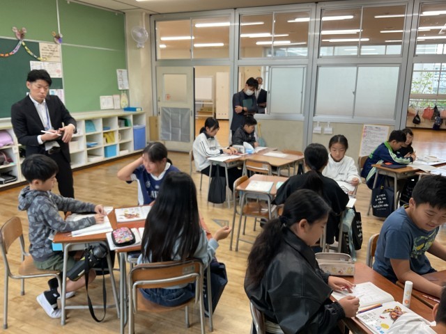 1年生の教室では、チャイム着席の様子をご覧になられていましたが、トイレから少し遅れてくる子も「遅れてすみません。」のあいさつをしたり、また先生も「トイレ行った子たちはすぐにもどられへん理由があってんな〜。」と説明をしたりと、お互いを思い合う素敵な場面を見ることができました。また、いろいろな教室で、子どもたちが課題に向かって自己選択・自己決定して取り組む個別最適な学びや、自分の考えを友だちと共有し学びを深める協働的な学びの場面が繰り広げられていました。子どもたちの学びの様子を大変ほめていただき、今日もうれしかったです。