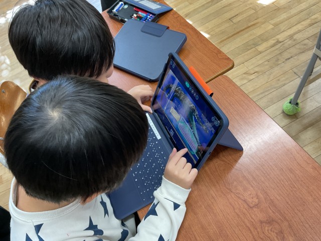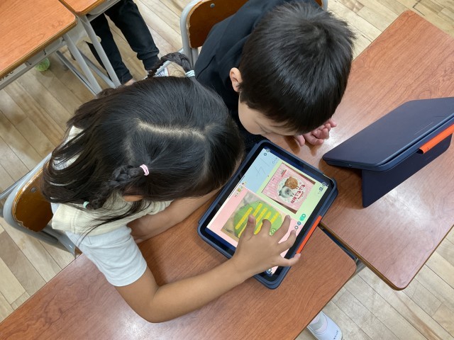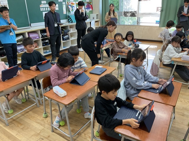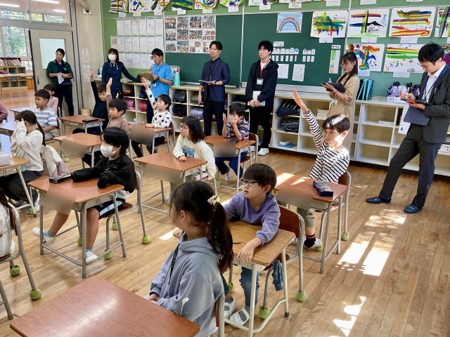 国語の授業では、どうぶつクイズを作るために、子どもたちが「すごい!」と思った動物の秘密について交流をしていました。1〜6年生のみんなが楽しめるようなクイズを作るために「なんで、そこがすごいと思ったん?」「わたしもそれ、知らなかった!」など活発な交流が行われ、子どもたちの意欲がとても高く、集中して取り組んでいたことに、参観された先生方も驚いていました。