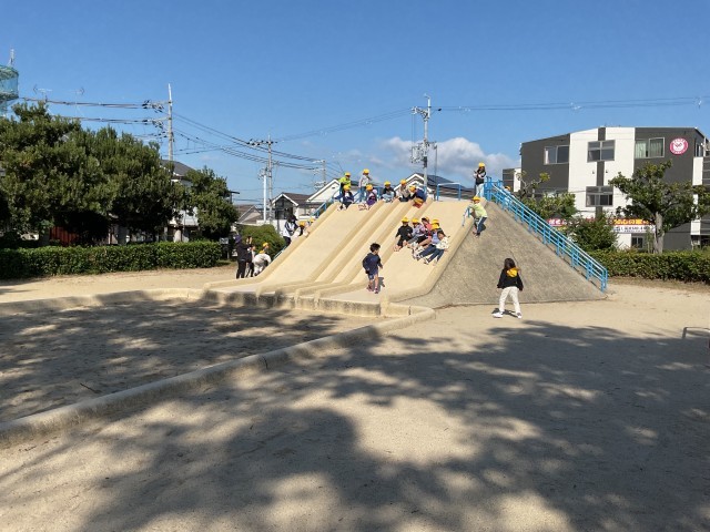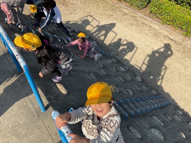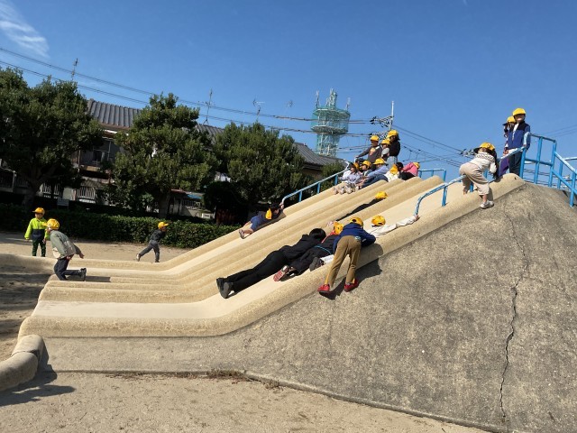 広場で鬼ごっこをした後は、遊具がある場所に移動しました。大きな滑り台、ブランコなどみんなで楽しい時間を過ごすことができました。