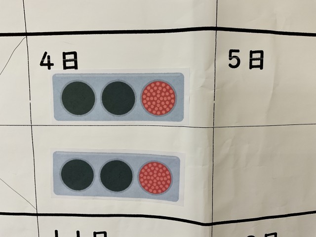 気になる信号の色は…赤!残念ながら、中休みも昼休みも赤信号でした。でも、今までと比べると、ろう下の歩き方を意識している人が増えているように感じます。明日の信号は何色かな??期待しています!