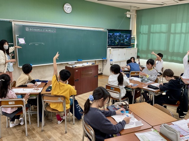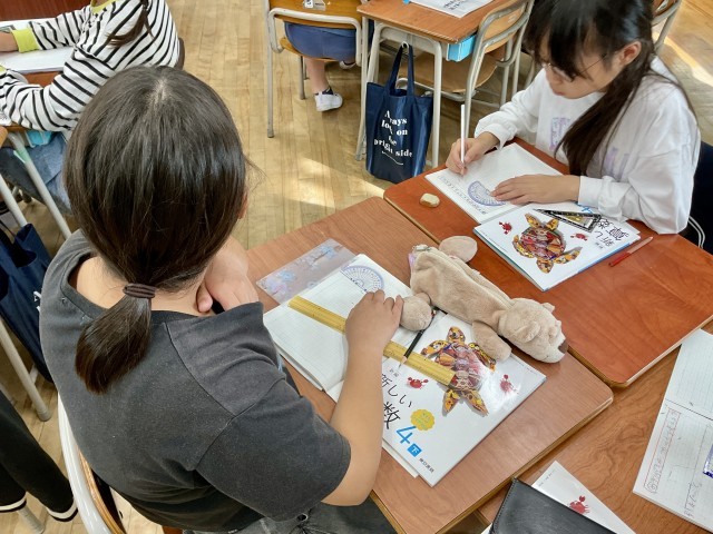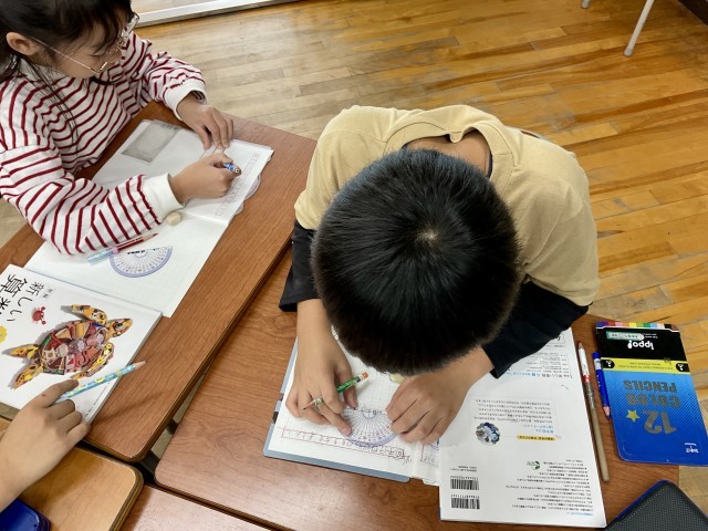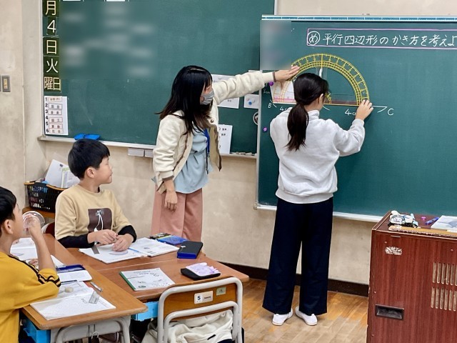 4年生の算数の学習で「平行四辺形」のかき方をみんなで考えていました。一辺はノートにかいてみたものの「さぁ、ここからどうしよう…。」「角度がわかるとかけるかも!」「あ、分度器を使うとかけるんちゃう?」と、次々とかきか方について、子どもたちのつぶやきが聞こえてきました。