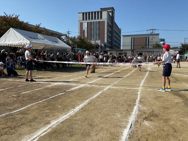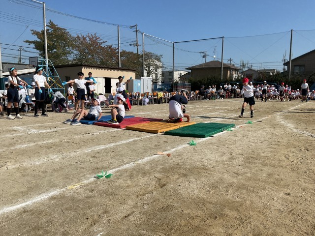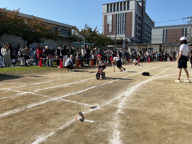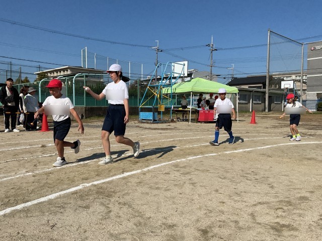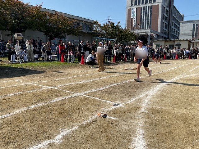 4年生の障害物競走は、なかなかの難しさでした。マットで前転した後は、縄跳びのかけ足とび。おたまかスプーンでピンポン玉を運んだ後は、運命の分かれ道。ストライダーに乗るのかぐるぐるバットをするのか、ずた袋でぴょんぴょんするのかアフロヘアーをかぶるのか…。歓声も多く、とても盛り上がりました♪
