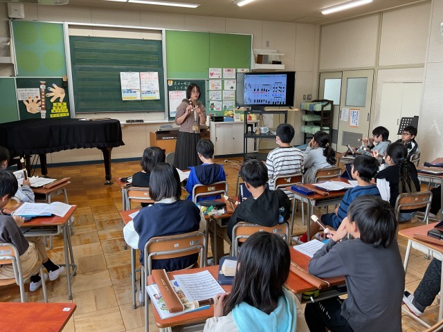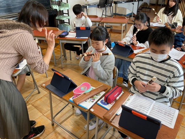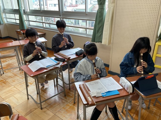 音楽室では、5年生が卒業式に向けてのリコーダー練習をまさに始めるところでした。指づかいがなかなか難しそうな曲ですが、子どもたちの真剣な様子に頼もしいなあと思いつつ、声こそ授業中なのでかけられませんでしたが、心の底から応援したくなりました。