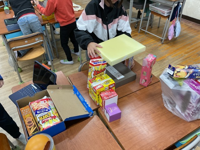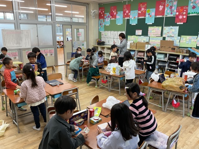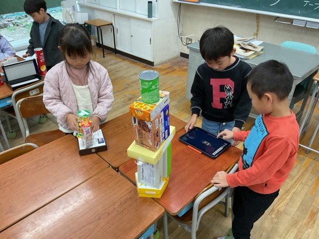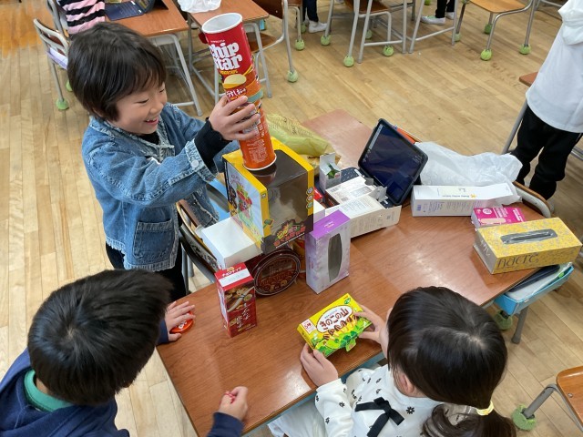 1年生の教室がとても盛り上がっていたので見に行くと、子どもたちがかたちあそびをしていました。いろいろな形の箱を組み合わせながら、いろいろな形を作っていました。
