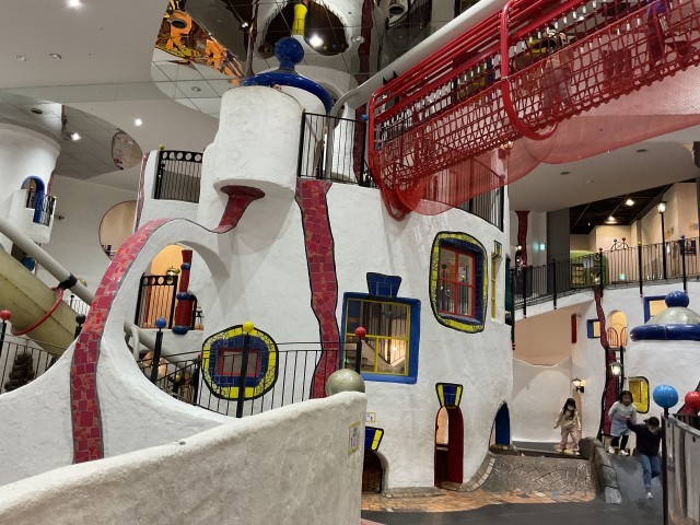 階段を登ってトンネルをくぐったり、クライミング?もあり迷路のような建物の中を子どもたちは元気いっぱい動きまわっています。