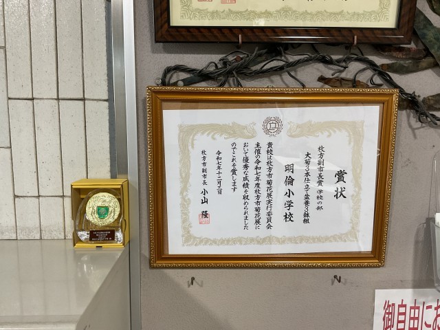 先日「11月14日(金) 枚方市菊花展2025」の記事でお知らせしていましたが、本日10時より、枚方市役所にて菊花展の表彰式が行われましたので、出席いたしました。明倫小学校は枚方市副市長賞という大変光栄な賞をいただきました。(早速、学校に戻った後に、玄関に飾りました!)