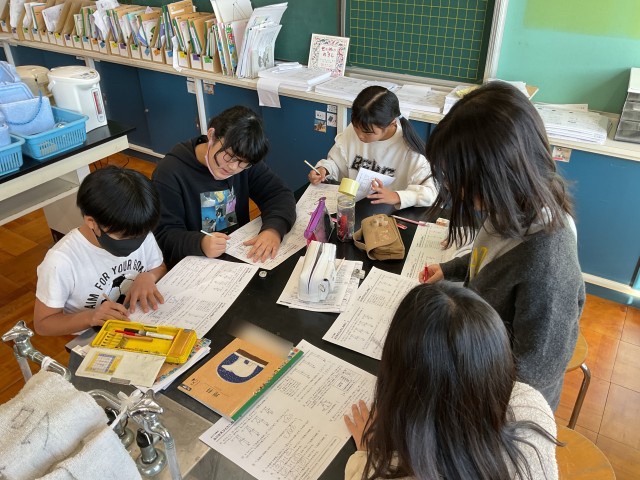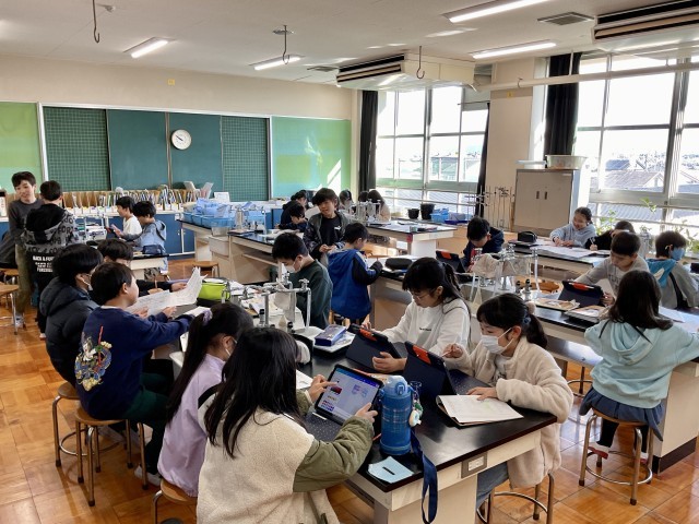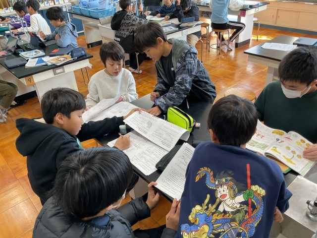 理科室に入ると「あれ?いつもとなんだか様子がちがうな?」と異変を感じました。それもそのはず、5年生全員で、理科の学習を行っていました。12月はどの教科も学期末でまとめの時期。何を学ぶか、だれと学ぶか(一人で学ぶか)、どのように学ぶか、自分で選んで学習していました。