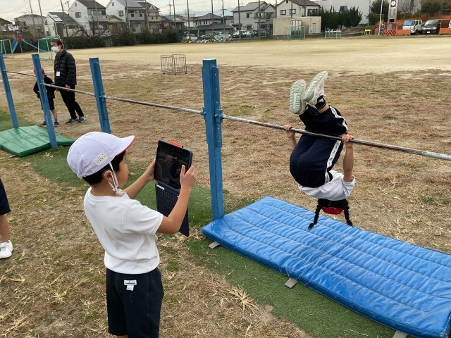 ペアのお友だちの技の様子を、タブレットで動画撮影していました。撮影後の映像を確認しては「もう少し、近くで撮って。」とか「反対側から撮って。」とか、より美しい演技になるように何度も取り組む姿が素敵でした。