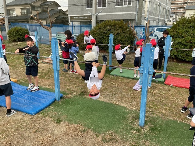 1年生が体育の学習で、運動場にいました。近づくと、私を見つけた子どもたちが「校長先生!見て!!」と、ご自慢の技をいろいろ披露してくれました。ふとんほし、つばめ、前まわり、地球まわり…。とても楽しそうに取り組んでいます。