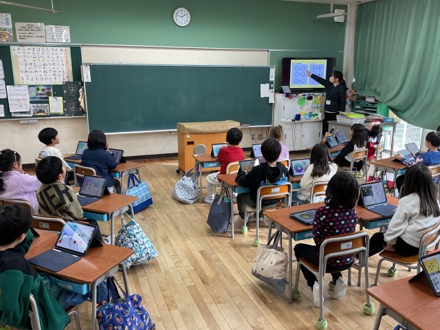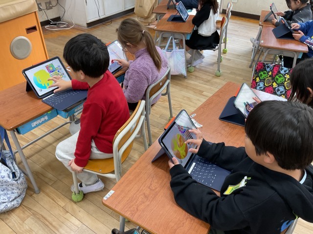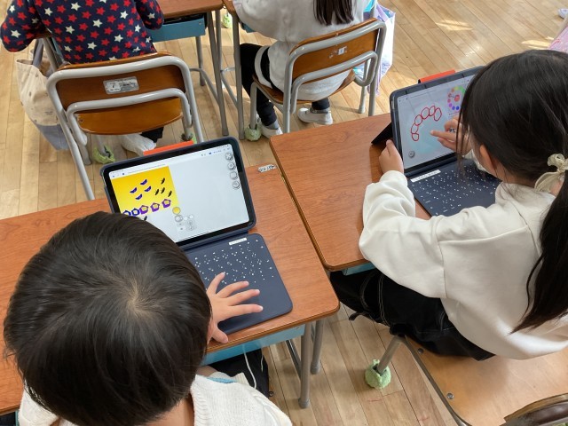 1年生の教室では、タブレットを使ってプログラミング学習を行っていました。Viscuit(ビスケット)は、かんたんにプログラミングを学ぶことのできるアプリです。「めがね」という仕組みを使って、絵を動かしたり、ゲームを作ったりすることができます。