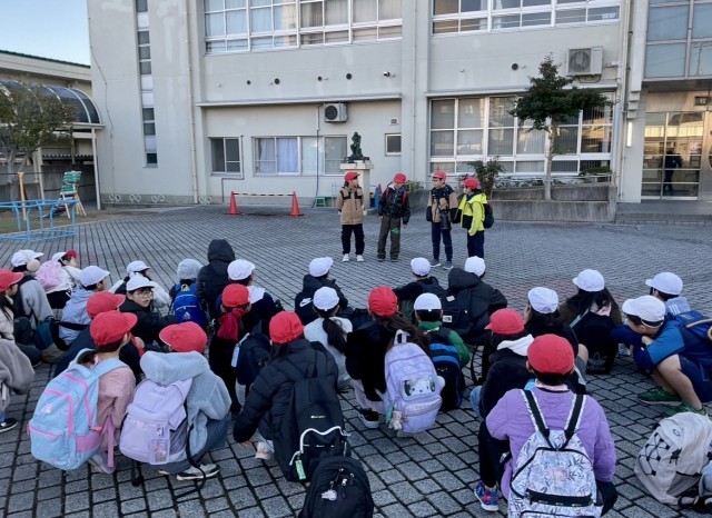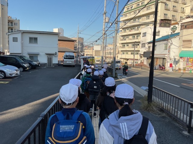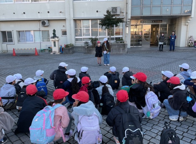 肌寒くはありますが、空は青々として、とっても良い天気です。実行委員の司会で、4年生の校外学習がスタートしました。今日はこの後、宮之阪駅から電車に乗って、大阪市立科学館へ向かいます。では、いってきます!