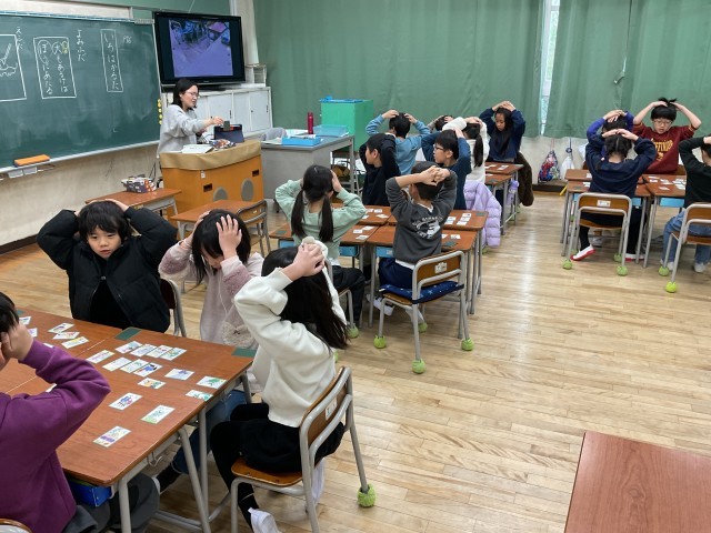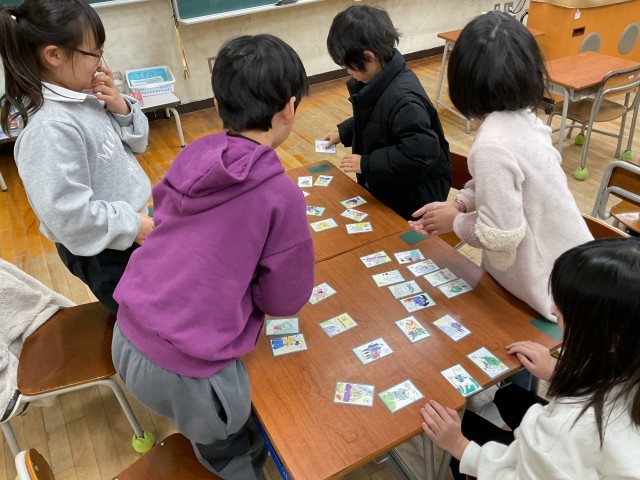 2年生の教室では、いろはかるたを使って、かるた遊びをしていました。ことわざや教訓、風刺などの文章が書かれていて、子どもたちにとってはなじみの薄いものもありましたが、かるたのルールは昔も今も変わりません。とても楽しそうに取り組んでいました。