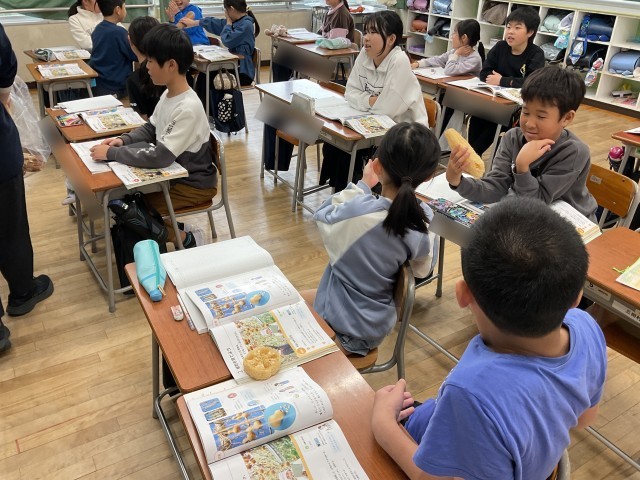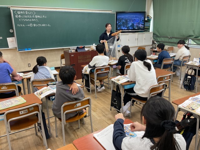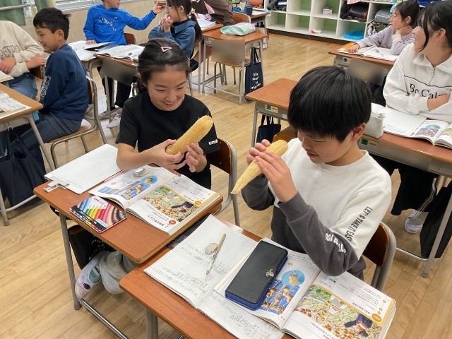 4年生の教室では、理科の学習をしていました。見ると、担任の先生が大きな大きなヘチマを持っていました。春には種だった、ヘチマやひょうたんが1年を過ぎ、どのように変化をしているのか観察しました。