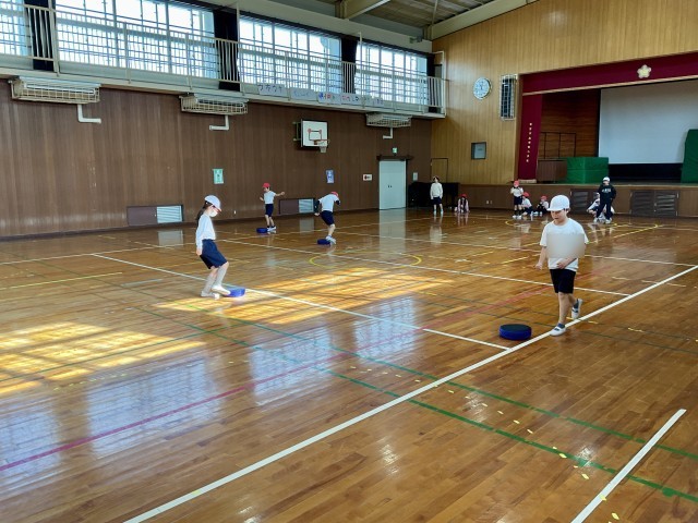 この用具はバウンドしにくく、空中を飛びにくく、弱い力でも遠くまで動くという特徴があります。転がり方が一定で、コントロールもしやすいので、ボール操作が苦手な子も参加しやすくなります。子どもたちは、大きな声で声をかけあいながら、とっても楽しそうに取り組んでいましたよ。