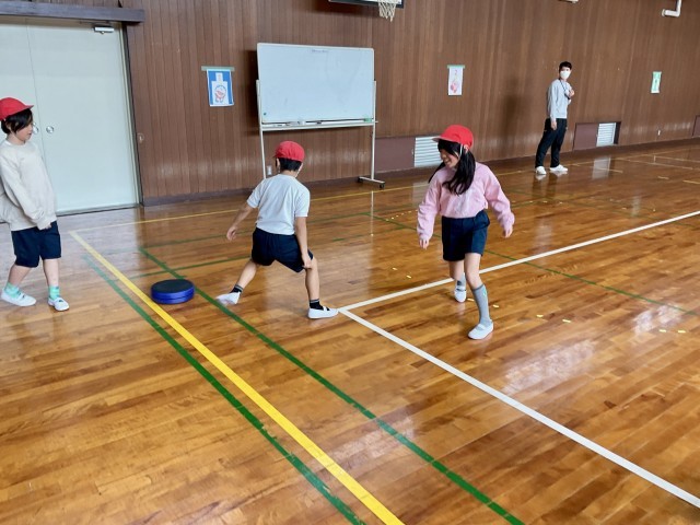 体育館で、3年生がディスクサッカーをしていました。3学期、各学年でゴール型ゲームをするのですが、ボールの代わりに、平たい円柱状(パック状)の用具を使って足でけるスポーツです。