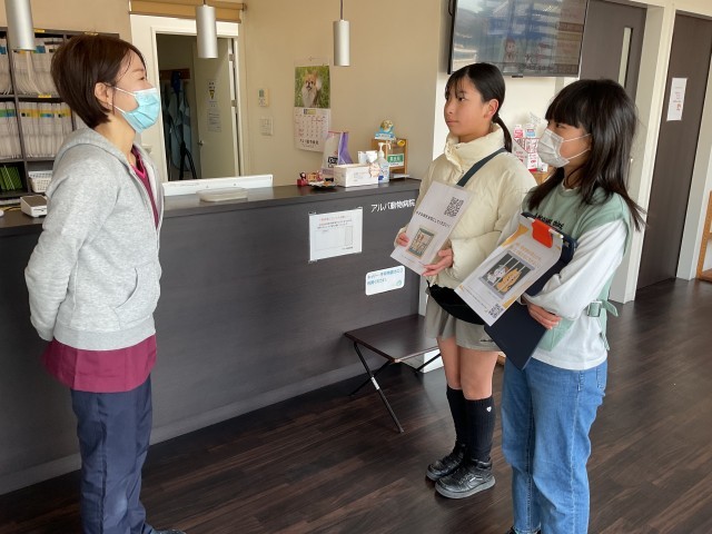 総合的な学習の時間の学習で、社会問題に取り組んでいます。フードロスや動物虐待など、自分たちで社会問題について調べてポスターを作成しました。作成したポスターを地域のスーパーや動物病院に持って行き掲示してもらえるようお願いをしに行きました。