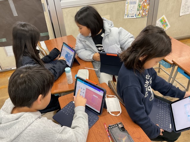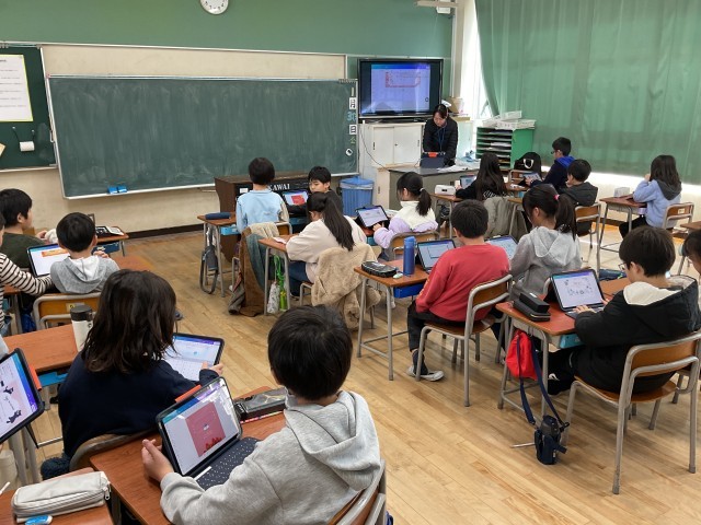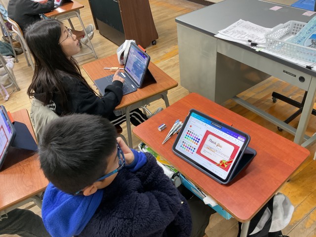 3年生の教室では、Canvaを使って「サンキューカード」を作っていました。背景のデザインや色、フォントなどいろいろな種類から自分で選んで、自分好みのカードを作り始めました。教室全体を見回すと、子どもたちの好みってこうも違うのか!と驚くぐらいです。