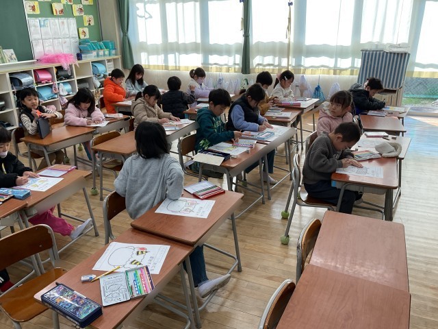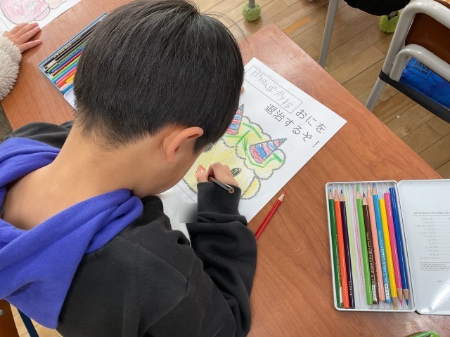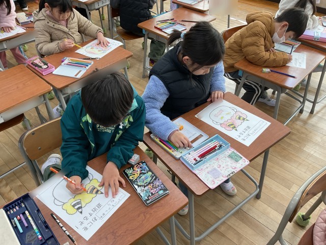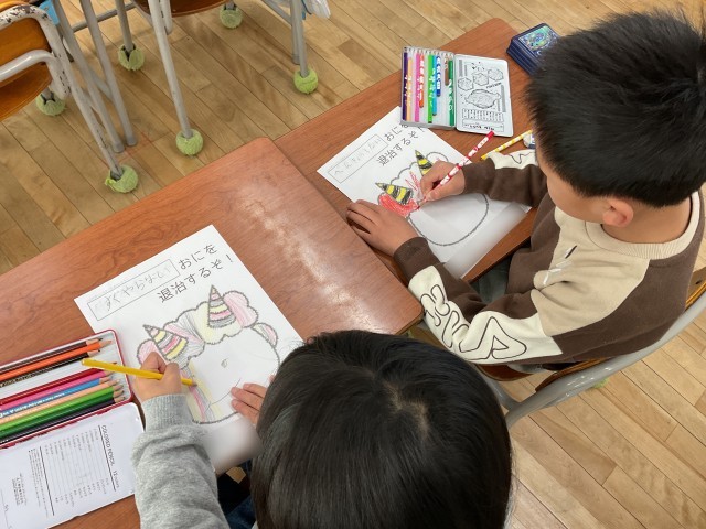明日は2月3日、節分の日です。1年生の教室では、鬼を形どったイラストに、子どもたちが思い思いの鬼の顔をかいたり、色をぬったりしていました。併せて、紙の上には「〇〇おにを退治するぞ!」と書いてあり、みんなで自分の中に潜んでいる鬼に名前をつけて、〇〇をうめて書いていました。