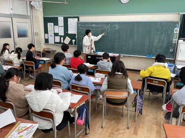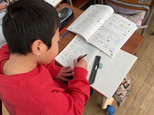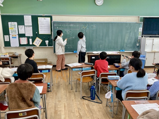3年生の教室では算数の学習をしていました。今日のめあては「2けた×2けたのひっさんのしかたを考えよう」です。これまでのひっさんの仕方を使って、少しずつ新しい計算のしかたが加わっていっています。子どもたちは、ノートに気づきをまとめながら、新しい問題に意欲的に取り組んでいました。