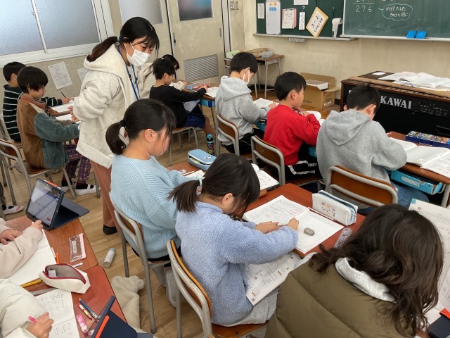 子どもたちの間を回りながら、「これ、どうやって計算するの?」と聞くと、次々に計算のしかたを答えていました。練習問題にタブレットやノートを使って集中して取り組む 子どもたちの姿にとても感心しました。「できた!」「わかった!」の反応がとってもうれしいですね。