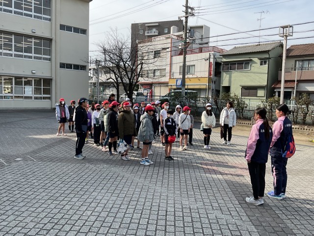 学生さんが小学校まで迎えに来てくれました。みんなで挨拶をした後に大学へ出発です!