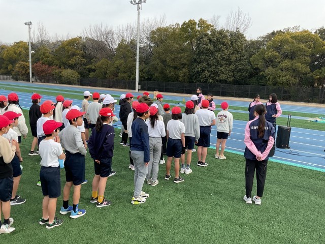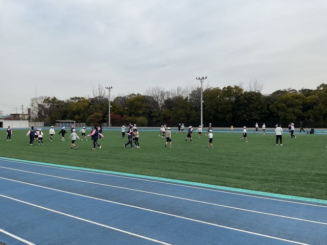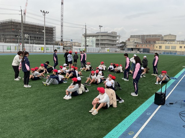実際に目の前で見ると、とても大きなグランドでした。ここで、ストレッチをした後に鬼ごっこをして体を暖めました。学生さんが鬼になり子どもたちは逃げます。子どもたちは息切れしていましたが、さすが駅伝部!息切れするどころか、段々スピードアップしていき、アップのジョギングをしているようでした。