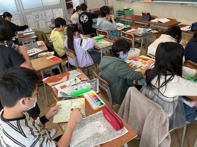 以前、となりのクラスの彫刻刀で彫る姿をブログに掲載(1月26日(月) 好きな動物の版画をつくろう)しましたが、今日の図工の様子を見に行くと、色をつけて刷ったり、刷られた紙に色をつけたりする活動をしていました。