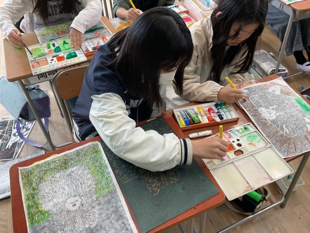 子どもたちの作品はとても丁寧に彫られていて、動物たちがいきいきとしていました。また色も、何度も何度もパレットで試しながら慎重に作っていて感心しました。