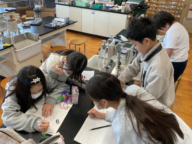 ふれあい広場では、6年生が理科の実験の真っ最中でした。今日の課題は、手回し発電機や光電池が乾電池と同じような働きをするのか、ということでした。実際に、手回し発電機や光電池を作って、実験開始!