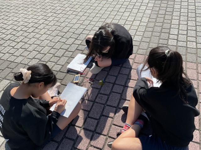 この時間、外はとってもいい天気で、気温も高く暖かくて、実験をするには絶好の日(時間)でした。子どもたちは、回す速さや光の強さなど、いろいろな条件の中で試しながら、あーでもないこーでもないと話をしながら、それぞれの性質を確かめていました。