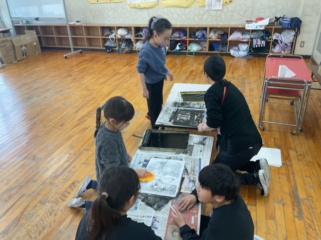 2年生のオープンでは、紙版画の台紙にローラーでインクをつけていました。真っ黒に塗られた作品を、恐る恐る紙に写しとっているところでした。