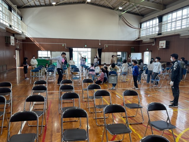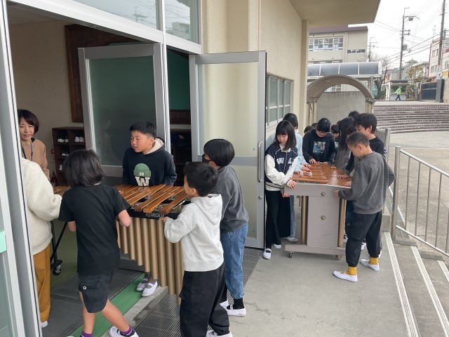 まずは、合奏のために使ういろいろな楽器を音楽室から運びます。その後、椅子やひな壇を並べるなどしました。一人ひとりがとてもテキパキと動いていて、あっという間に式場が出来上がりました。