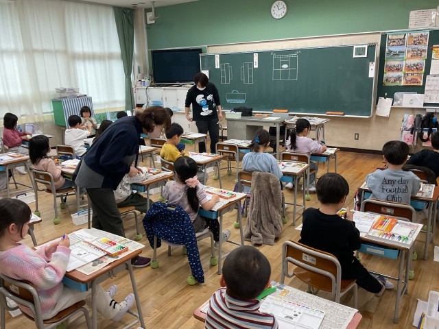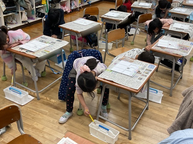 1年生が図工の学習で、初めて絵の具セットを使っていました。ピカピカのパレットに、恐る恐る絵の具を出しているところでした。教室に入るとすぐに「これくらいでいい?」と絵の具の適量を聞かれましたが、米粒ほどに小さくて思わず笑いそうになりました。大切に大切に使おうとしている様子がよくわかり、自然と笑顔になります。