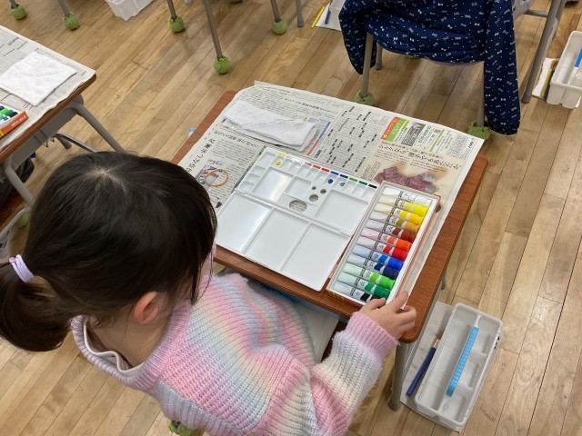 その後は、水入れ用のバケツに水を入れて4つのお部屋のちがいを先生に教わりました。「そこ、いのちの水!」すでに絵の具を使ったことのある子どもがうれしそうに声をあげています。子どもたちのわくわくが止まらない、初絵の具。このあと線を描きました。これから、少しずついろいろな使い方を学んでいこうね。