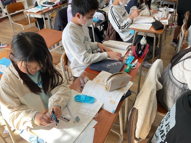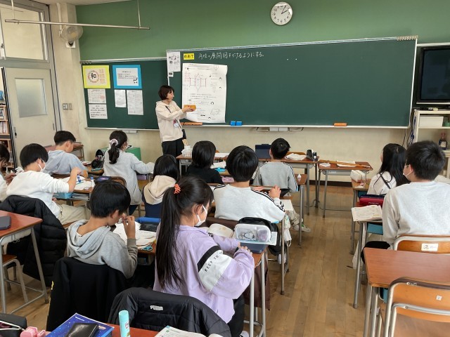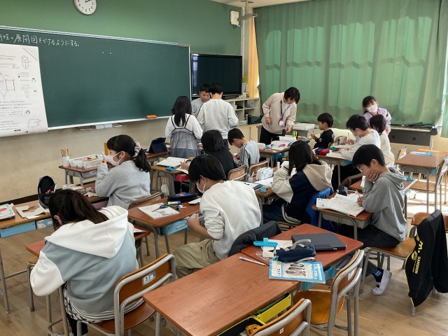 5年生の教室に入ると、算数の学習をしていました。学んでいたのは、三角柱の展開図。実際に工作用紙を使って、三角柱を組み立てていました。底面や側面の大きさの実際と、教科書の大きさは違うので、なかなか見取図から展開図をかくのは難しい。子どもたちのも悪戦苦闘していました。